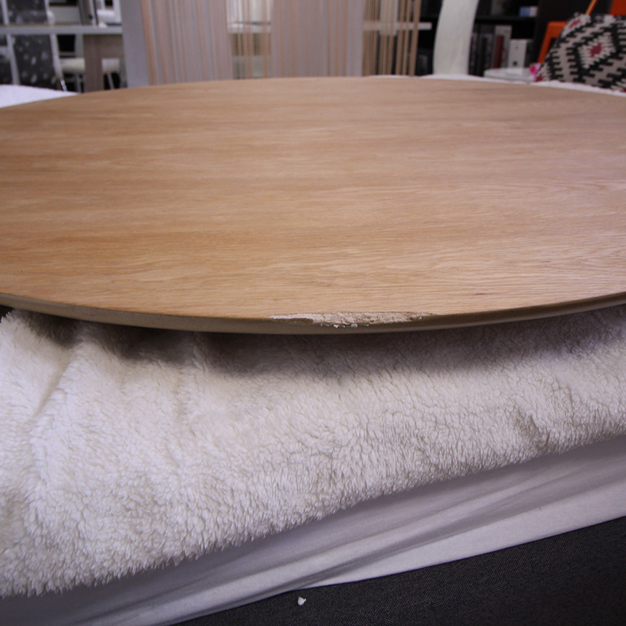 Jedálenský stôl Nagy sa predáva v 2. akosti, pretože má narazenú hranu dosky v rozsahu cca 10 cm, viď fotografie. Na túto vadu nie je možné uplatniť reklamáciu.
