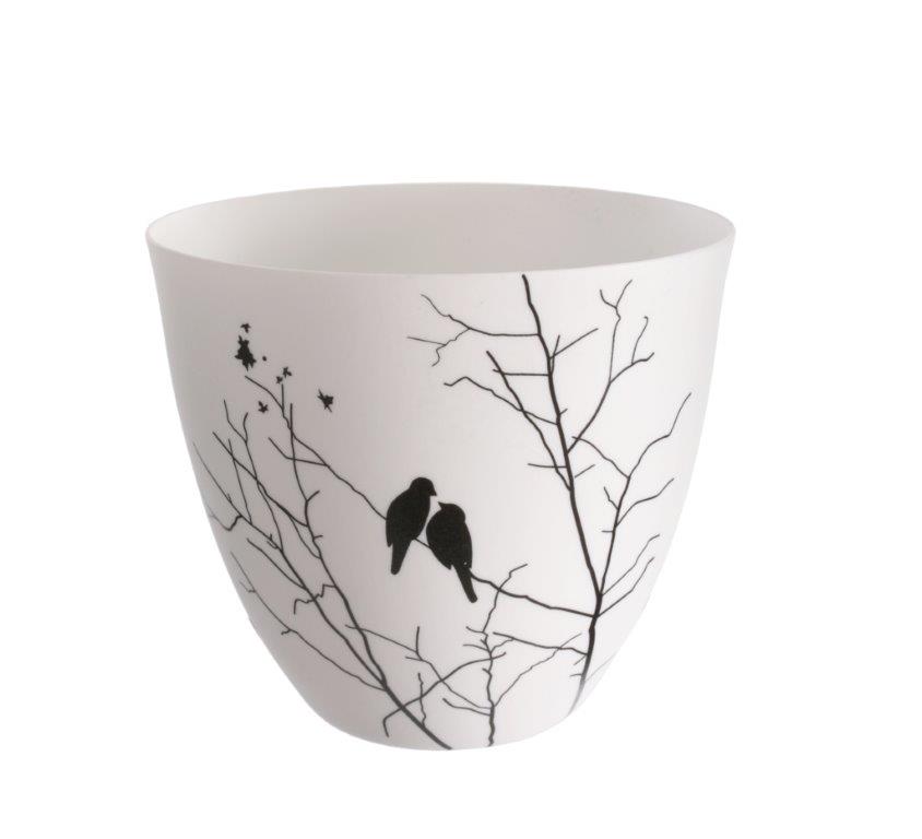 Porcelánový čajový svietnik Porslin je ozdobený motívom vtáčikov sediacich na vetvičke.