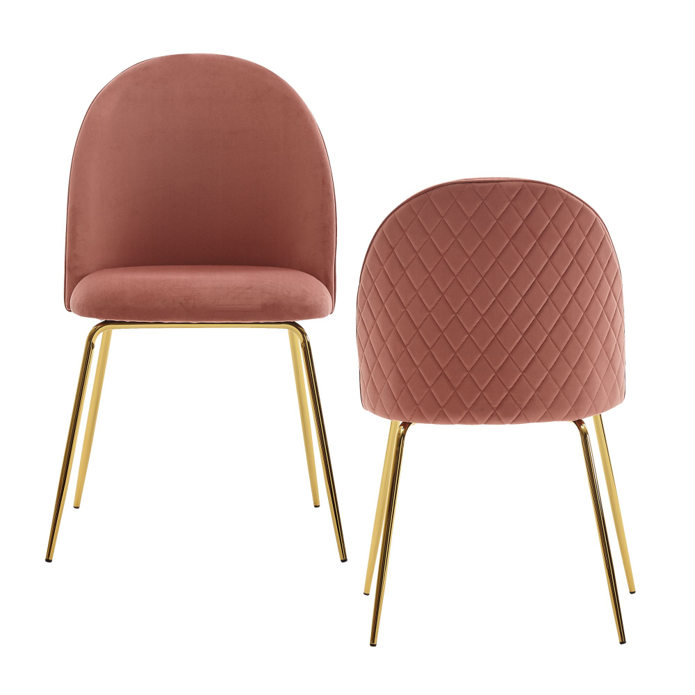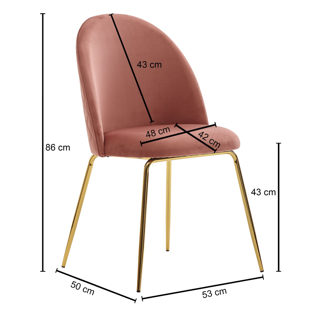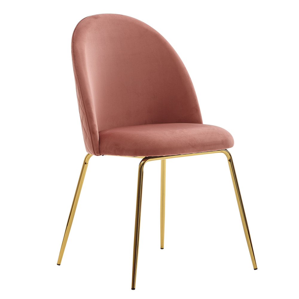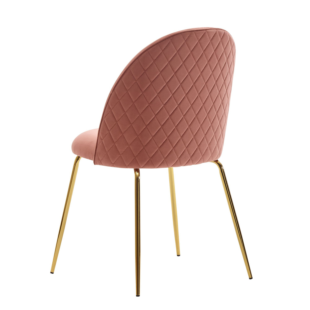 Moderná dizajnová stolička Selen s tvarovaným, prešívaným sedákom zo zamatu v ružovej farbe. Perfektnú stabilitu zaisťuje kovová podnož v zlatej farbe. Táto štýlová stolička sa perfektne hodí do moderných interiérov.
