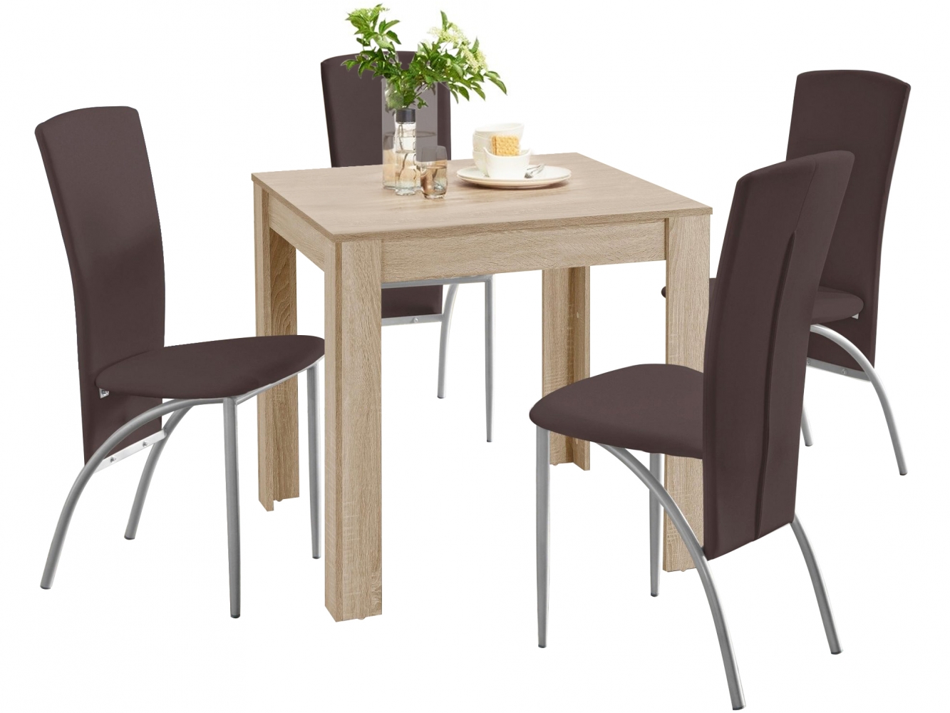 Jedálenská súprava Dane je moderný jedálenský nábytok, ktorý sa hodí do všetkých interiérov. 4 jedálenské stoličky s mäkkým sedákom, čalúneným syntetickou kožou, vás zaujmú svojim dizajnovým tvarom. Súčasťou súpravy je aj jedálenský stôl z MDF v dekóre duba.