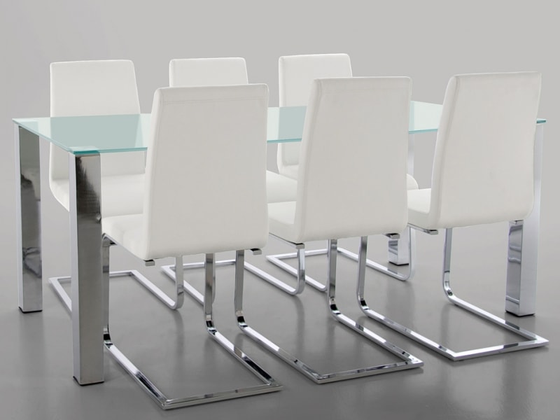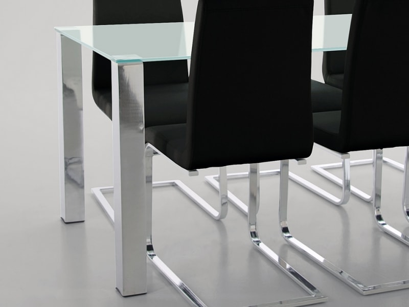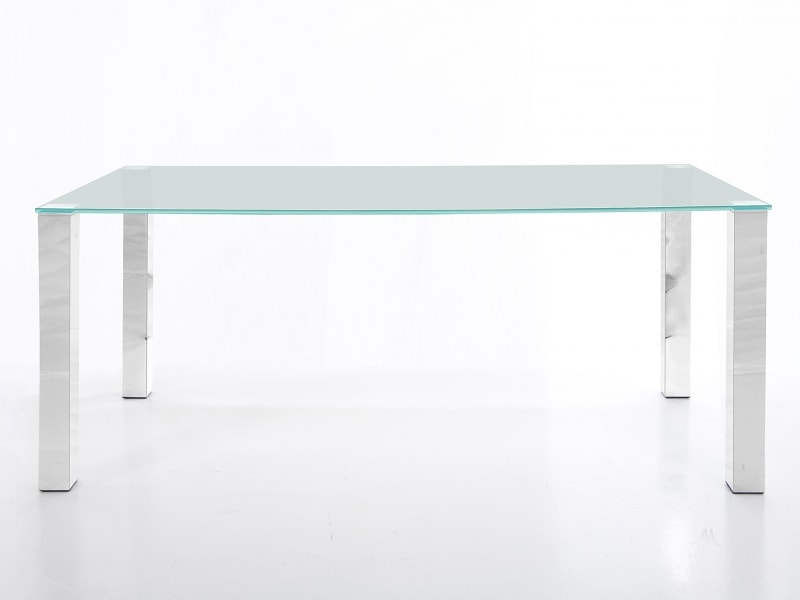 Jedálenský alebo jednacístôl v modernej kombinácii kovových nôh a sklenenej dosky. Obdĺžnikový tvar, neutrálne štvorcové kovové nohy a stolová doska z bezpečnostného skla hr. 12 mm umožňujú tento stôl umiestniť prakticky do akéhokoľvek interiéru - do jedálne, jednacej miestnosti, pracovne apod.