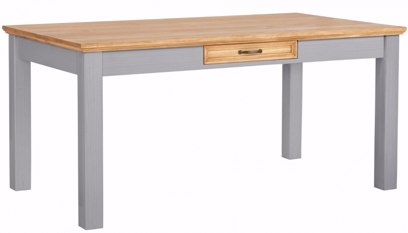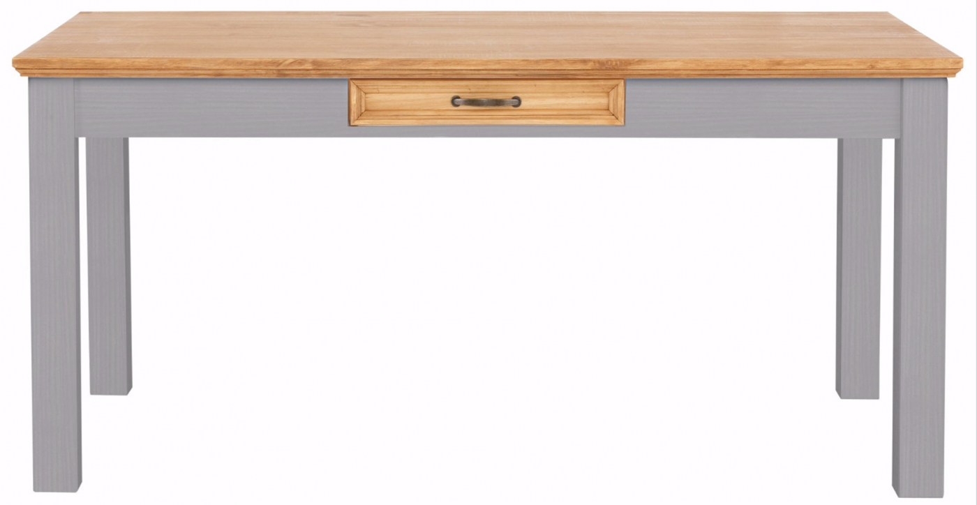 Jedálenský stôl Yvet je dizajnový nábytok vo vidieckom štýle, ktorý vás očarí svojím jednoduchým spracovaním a čistými líniami. Stôl je vyrobený z masívneho borovicového dreva v sivej farbe. Ďalej ponúka praktickú zásuvku na uloženie potrebných vecí. Hodí sa do jedálne či kuchyne.