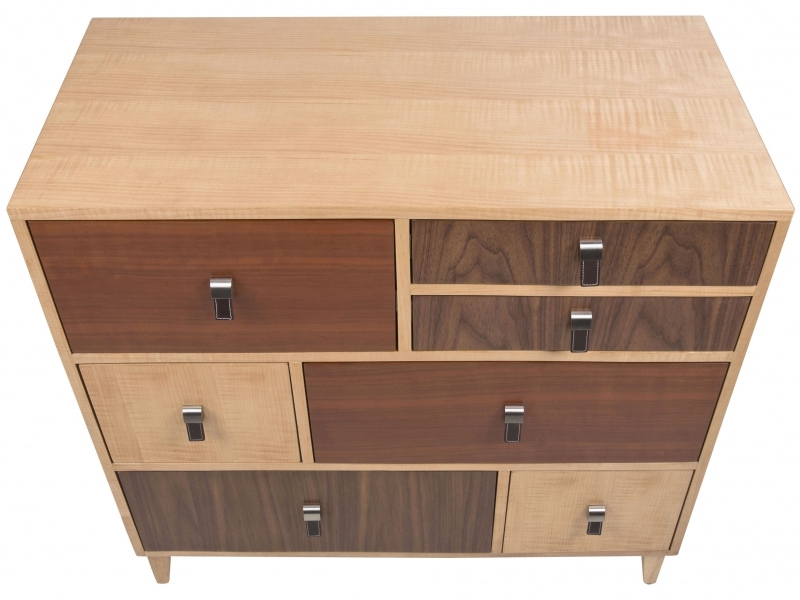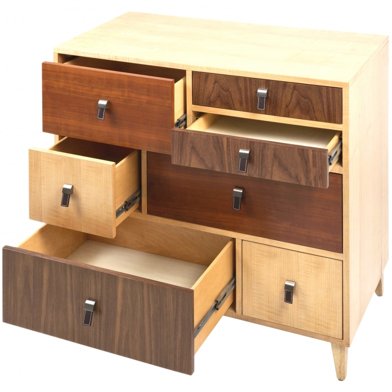 Komoda so 7 zásuvkami z rady dizajnového nábytku Marella je exkluzívnym kusom nábytku z niekoľkých druhov prírodnej dyhy. Kým korpus a nohy sú z javorovej dyhy, čelá zásuviek sú z javora, orecha a čerešne. 7 zásuviek v štyroch veľkostiach je opatrených kovovými pojazdmi a originálnymi úchytkami. Prírodné materiály v tomto praktickom balení predstavujú harmonické spojenie moderného a retro dizajnu.