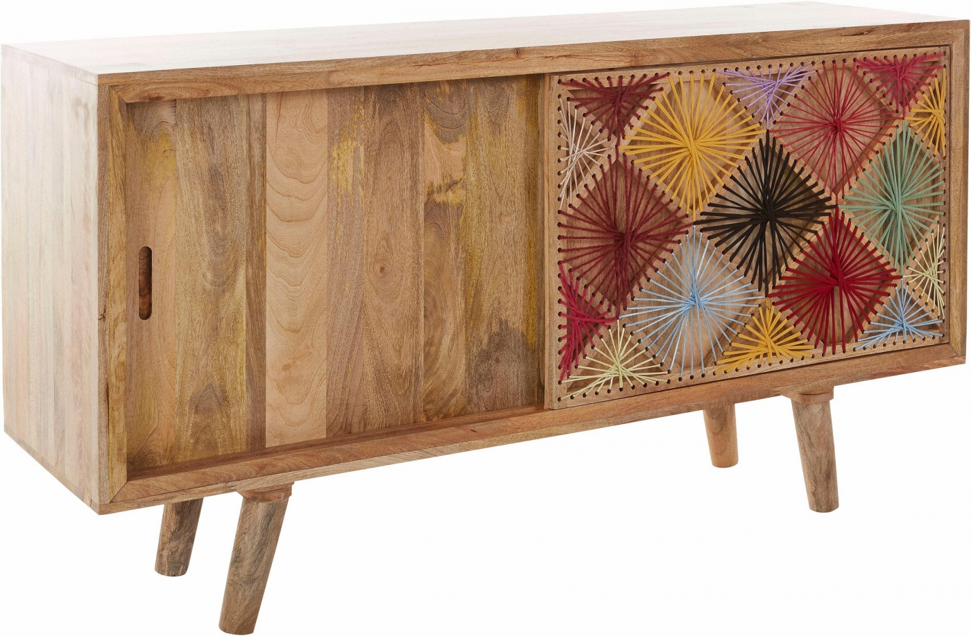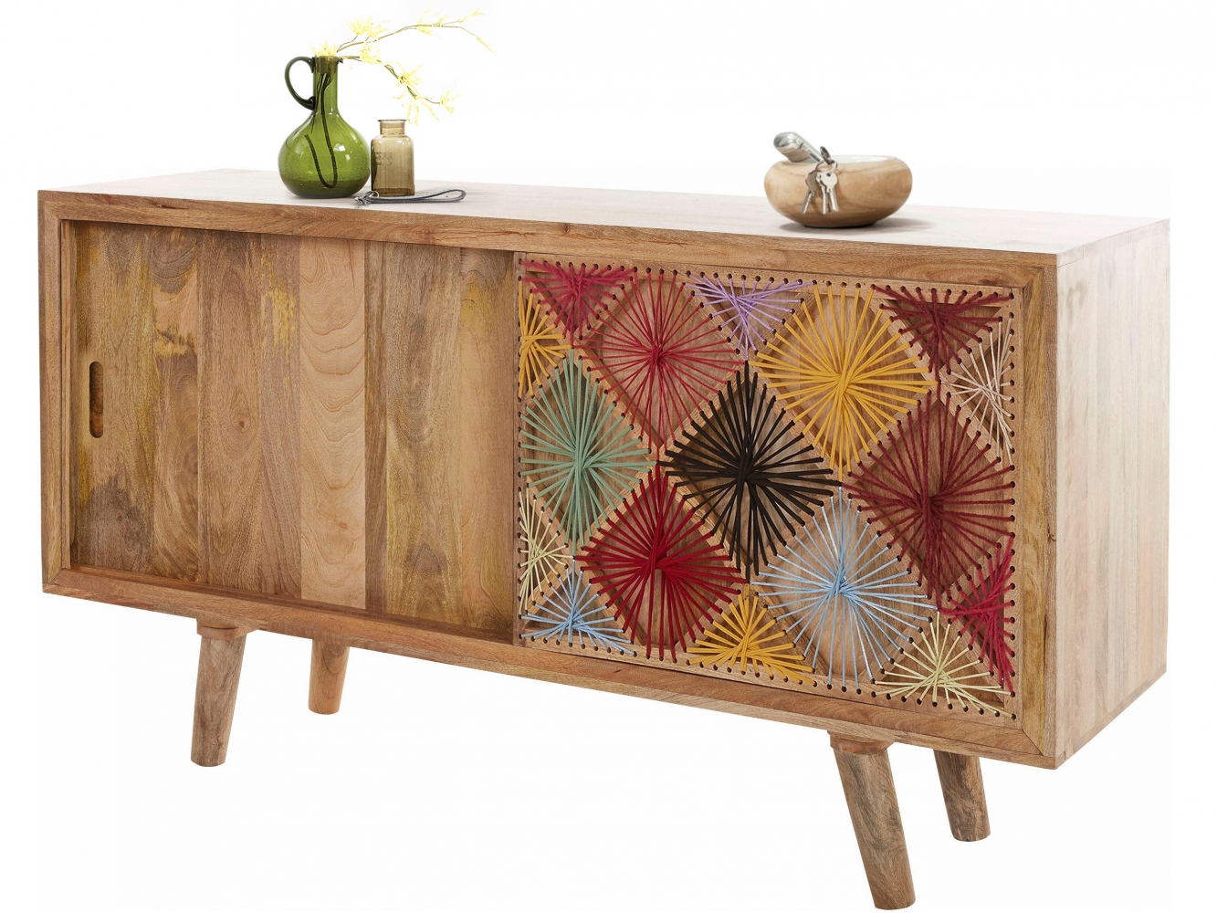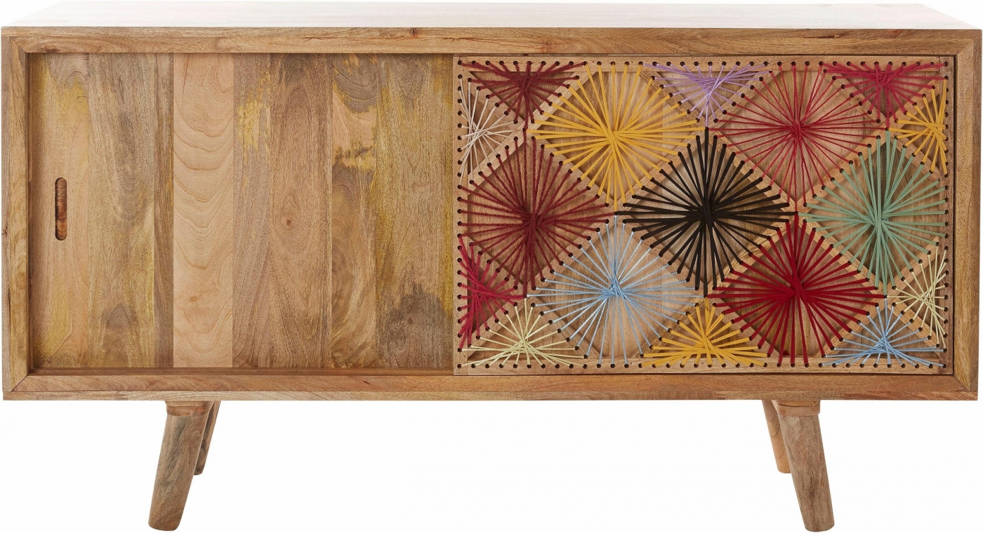 Komoda Ston vás nadchne svojím vzhľadom. Je ladený do retro štýlu a na zaujímavosti mu pridáva bavlnené vyšívanie v posuvných dvierkach. Je vyrobený z masívneho mangového dreva. Disponuje posuvnými dverami s vnútornou policou. Hodiť sa bude obzvlášť k ďalšiemu nábytku z dreva, či už v klasickom alebo retro štýle.