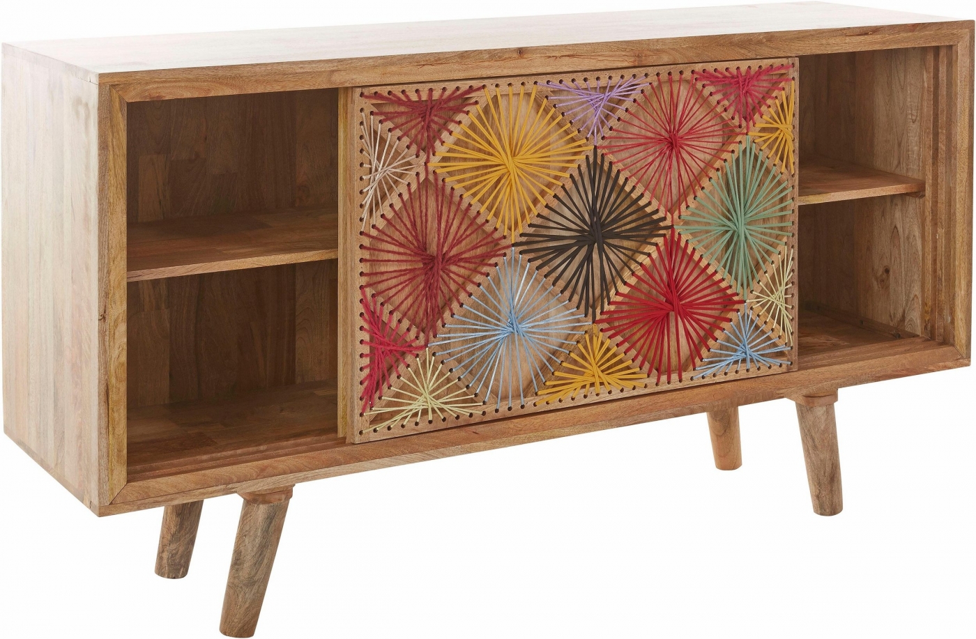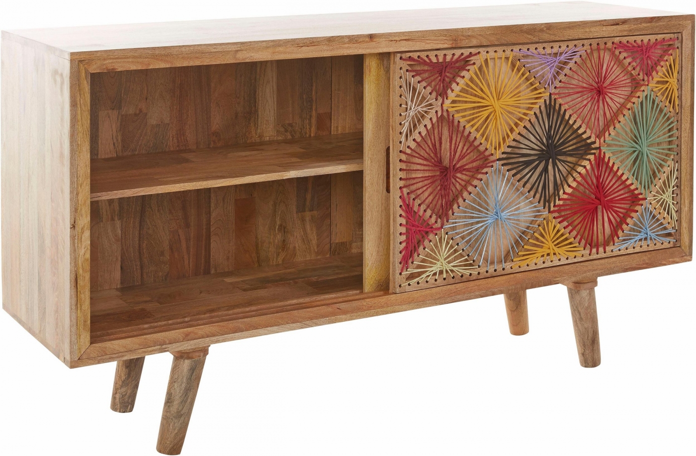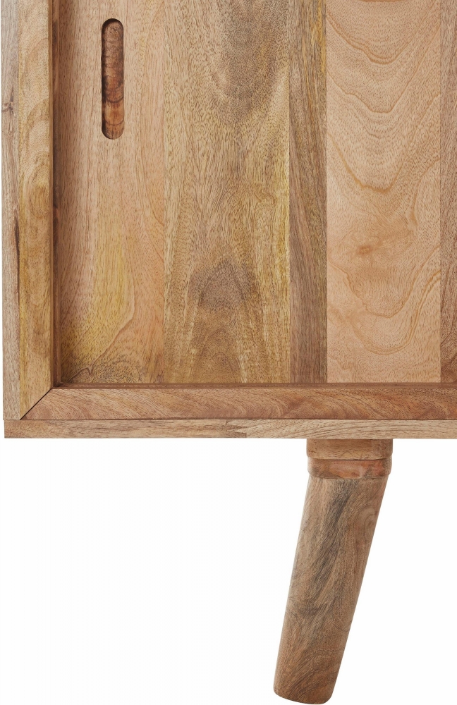 Komoda Ston vás nadchne svojím vzhľadom. Je ladený do retro štýlu a na zaujímavosti mu pridáva bavlnené vyšívanie v posuvných dvierkach. Je vyrobený z masívneho mangového dreva. Disponuje posuvnými dverami s vnútornou policou. Hodiť sa bude obzvlášť k ďalšiemu nábytku z dreva, či už v klasickom alebo retro štýle.