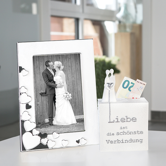 Rámček na fotky Elmo je praktický doplnok do vášho interiéru. Vystavte si v ňom obľúbené fotografie a majte ich stále na blízku. Rámček je ozdobený romantickým motívom srdiečok.
