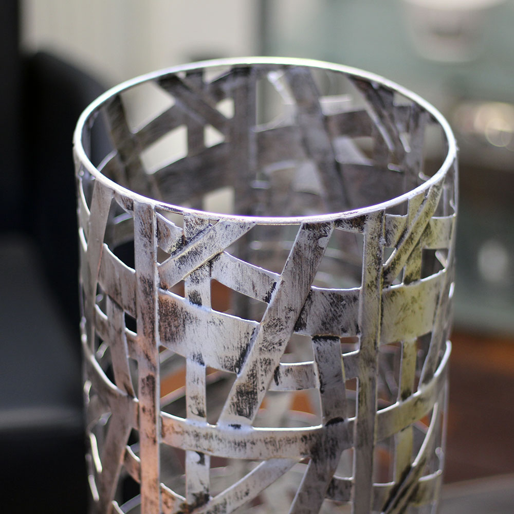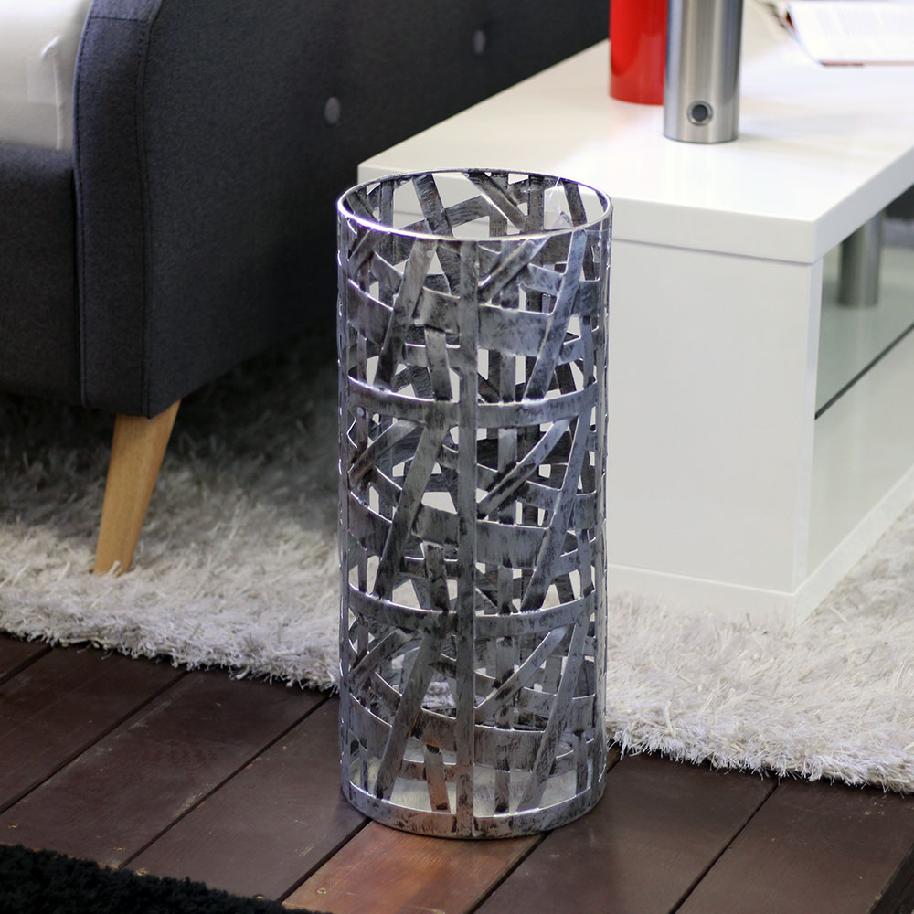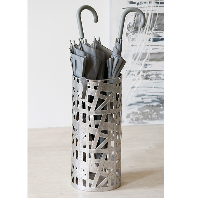 Stojan na dáždniky Mephis je celokovový. Povrchová úprava kovu je v starožitnej striebornej farbe, ktorá necháva vyniknúť nedokonalosti a dodáva stojanu nádych starobylosti.
