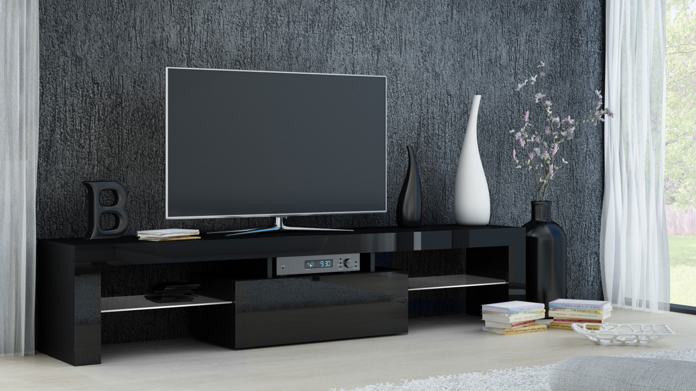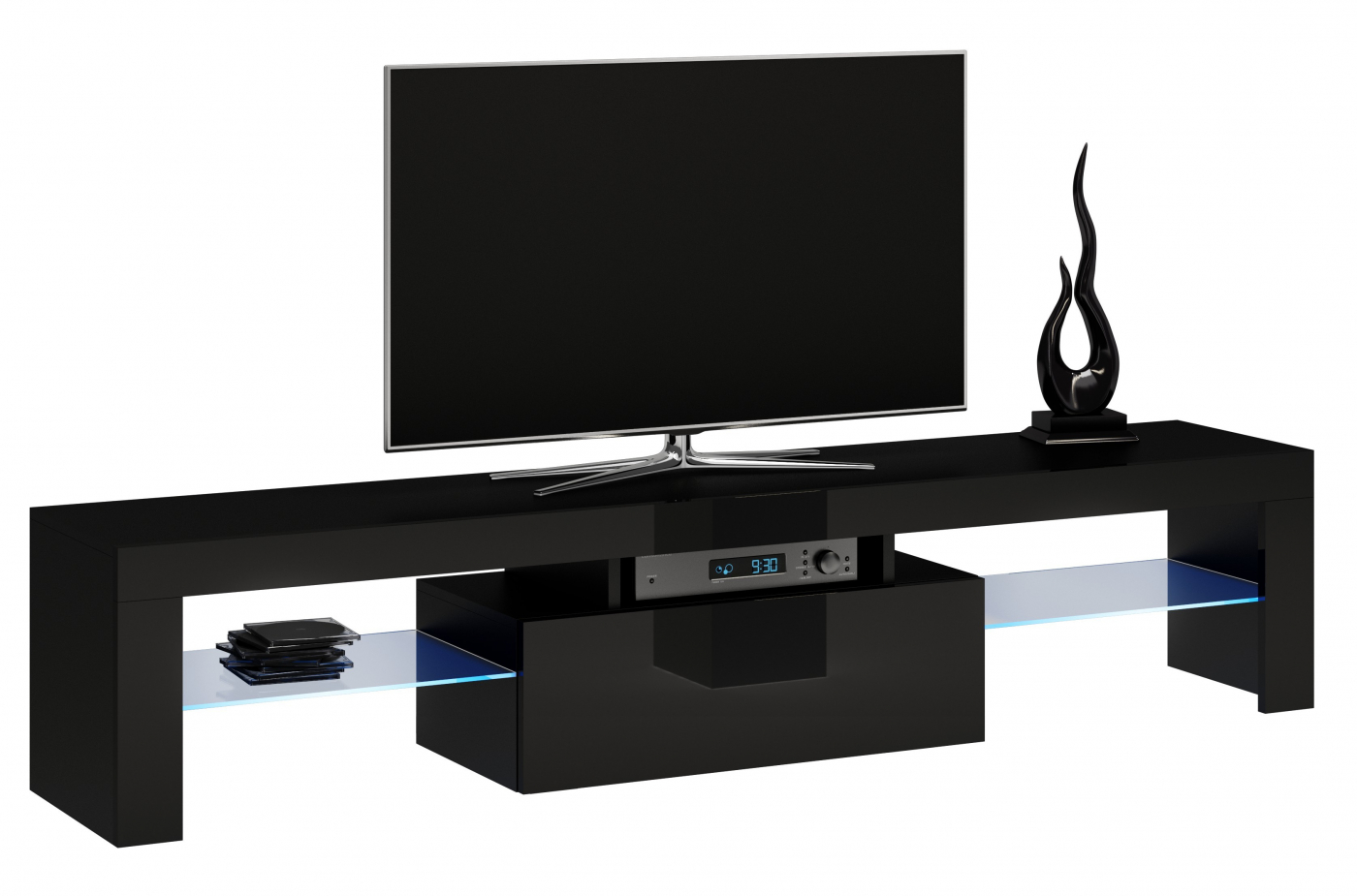 TV stolík Deko v lesklej čiernej farbe sa stane jedinečným a štýlovým doplnkom vášho interiéru. Obdĺžnikový korpus z drevotrieskovej dosky ponúka priestranný úložný priestor. Atraktívny kontrast dodáva otvorená polica, vďaka tomu sa tento TV stolík sa hodí nielen do moderných, ale aj klasických interiérov.